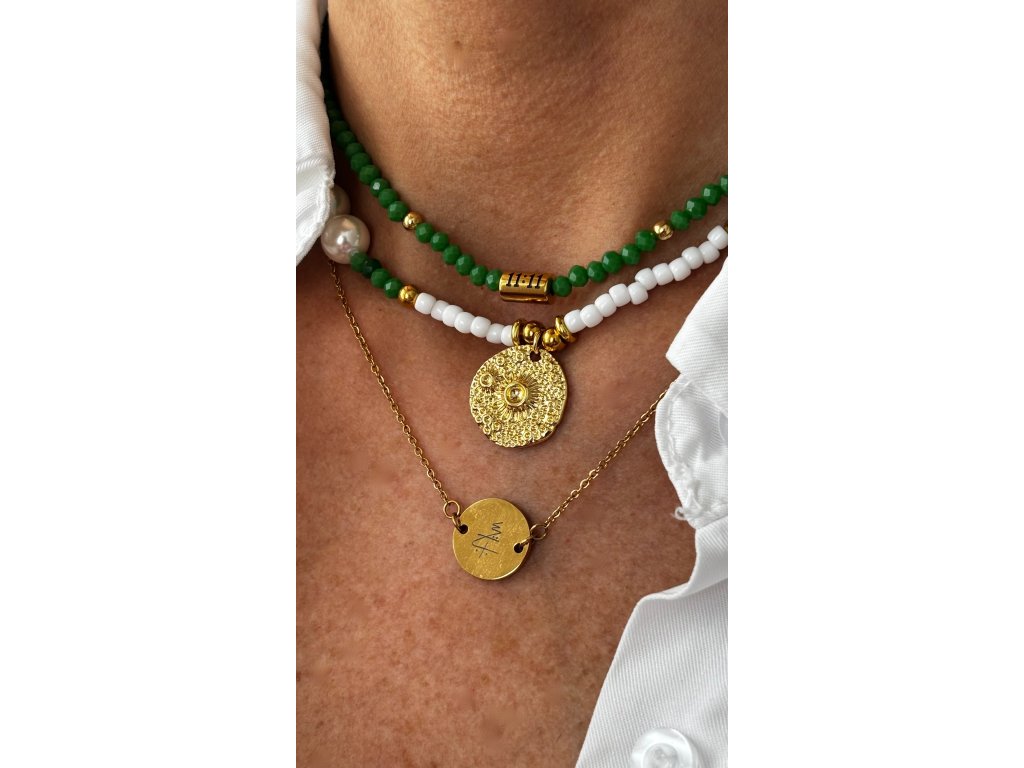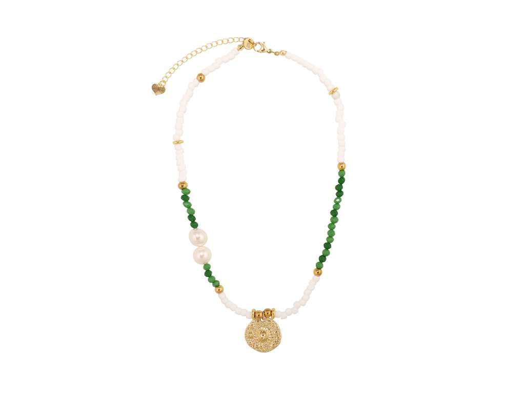 Timeless elegance in a delicately luxurious design. Aurora Verde is a necklace designed for the modern woman who pays attention to detail. The combination of fresh green crystal, natural freshwater pearls and minimalist white beads is complemented by an 18K gold-plated pendant with a sun symbol – a striking accent that makes it an exceptional accessory.
