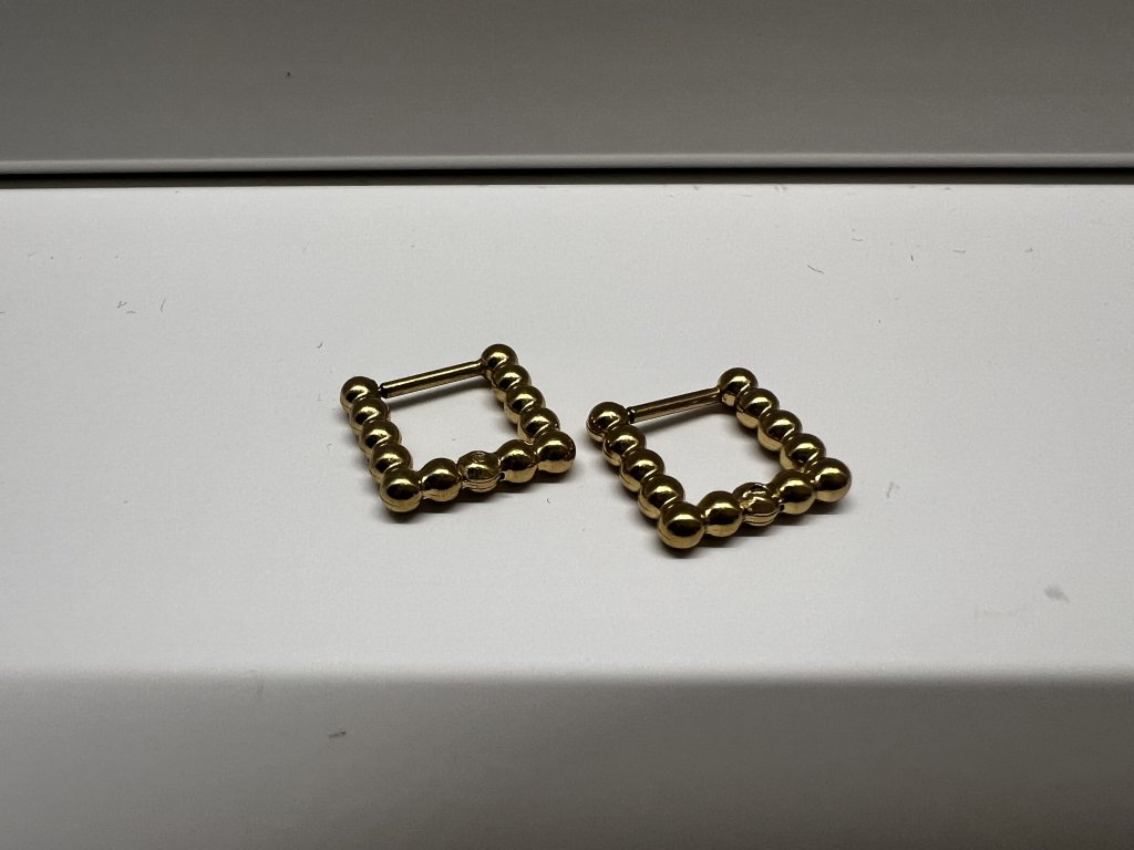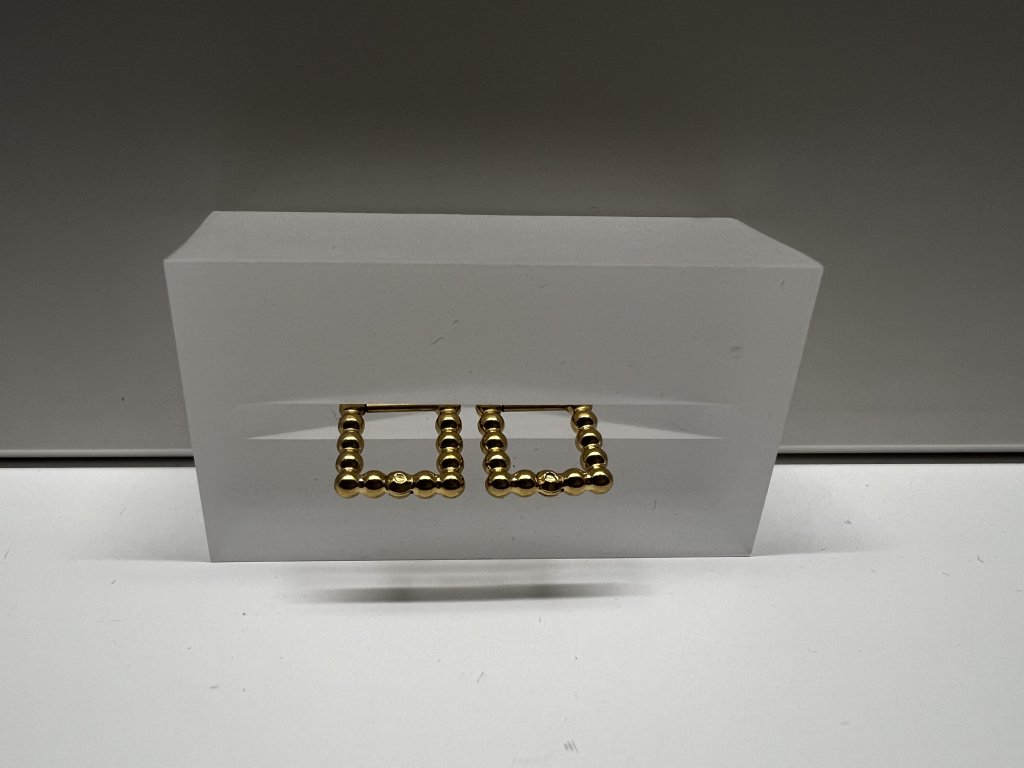 Elegant and timeless earrings decorated with delicate beads, plated with 18k gold. Their geometric double square design looks stylish and minimalist at the same time – the perfect accessory for both daytime and evening outfits.
