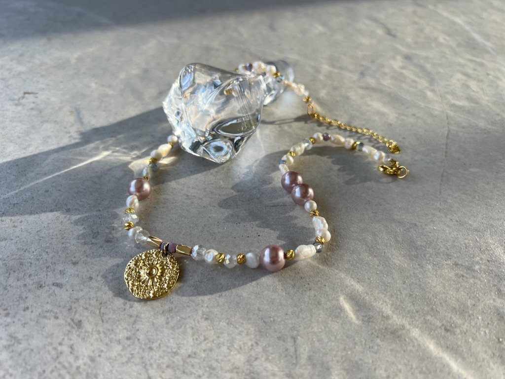 This unique necklace is the embodiment of luxury and delicacy. Handcrafted from river pearls and crystals, accented with striking pink pearls and 18k gold-plated bead details, it acts as a modern talisman of feminine power, elegance, and spiritual balance.
