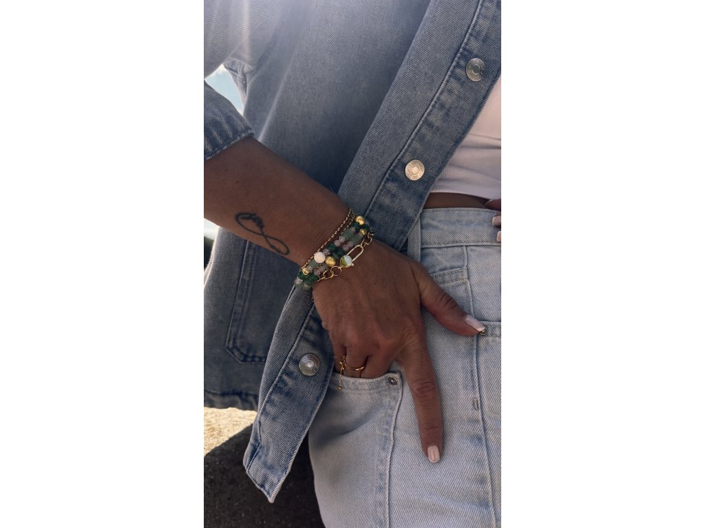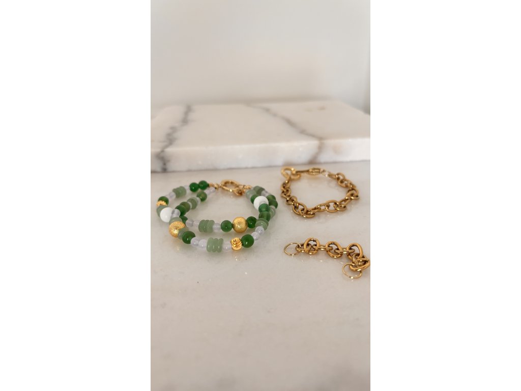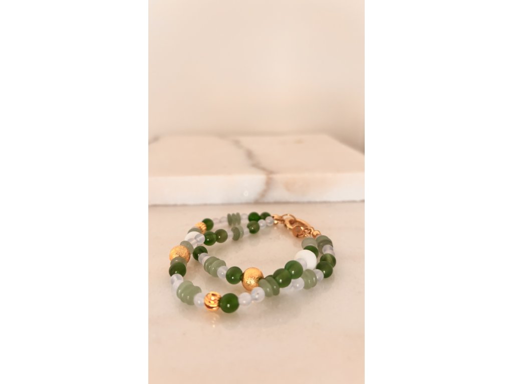 This unique 2-in-1 piece can be worn as an elegant necklace, a stylish bracelet, or divided into two – a delicate 18K gold-plated chain bracelet with gold beads and a double-row bracelet made of natural stones.