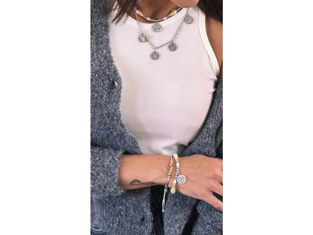 An elegant necklace that combines the delicacy of pearls with the power of hematite. Hematite is known as a stone of protection and inner balance, while pearls symbolize purity and femininity. The dominant pendant with a sun motif gives the jewelry a unique meaning – energy, optimism, and new beginnings.