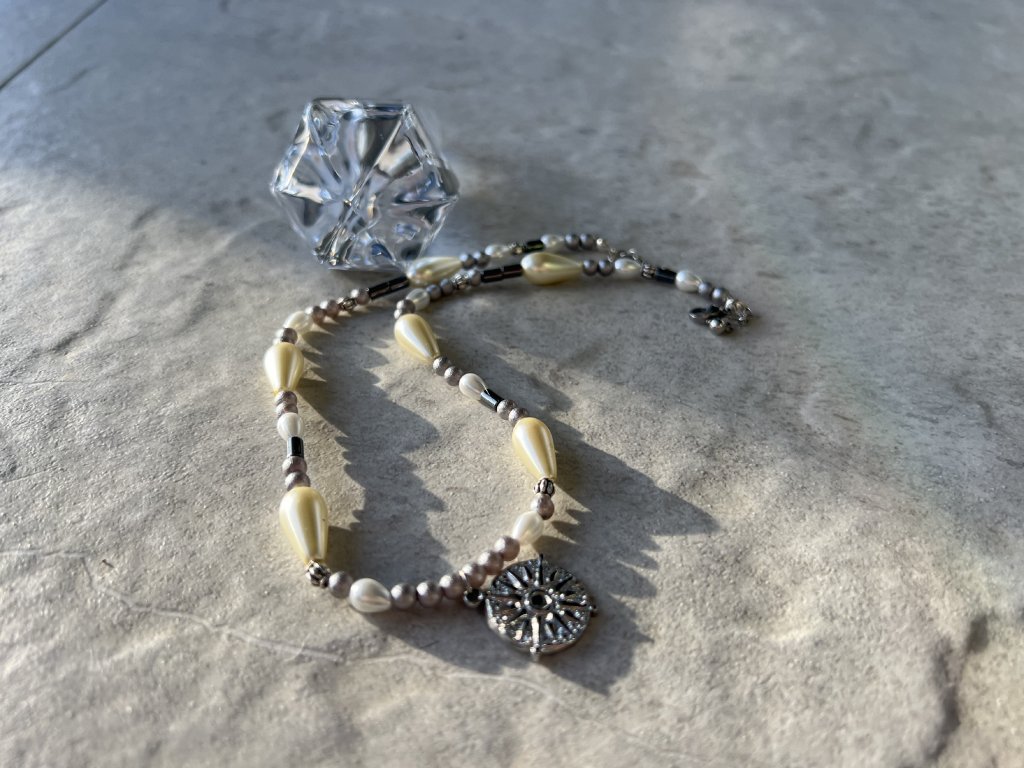 Necklace with pearls, hematite, and sun pendant.