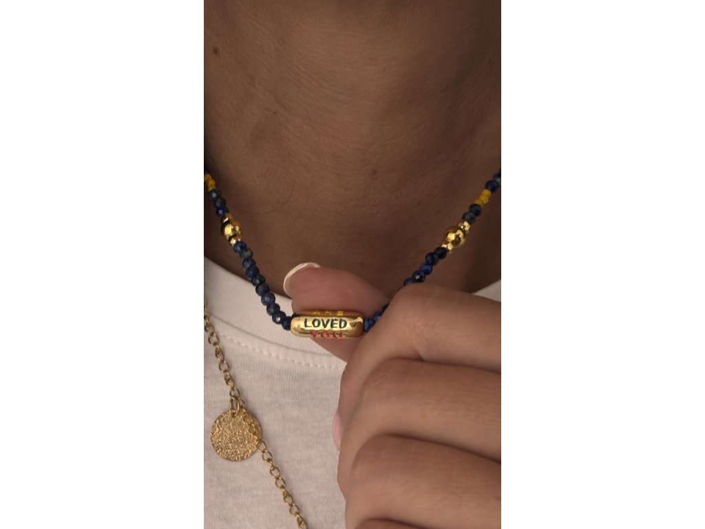 This luxurious necklace combines the deep blue energy of lapis lazuli, bright cut yellow beads, and elegant 18K gold-plated details that look stylish and feminine.