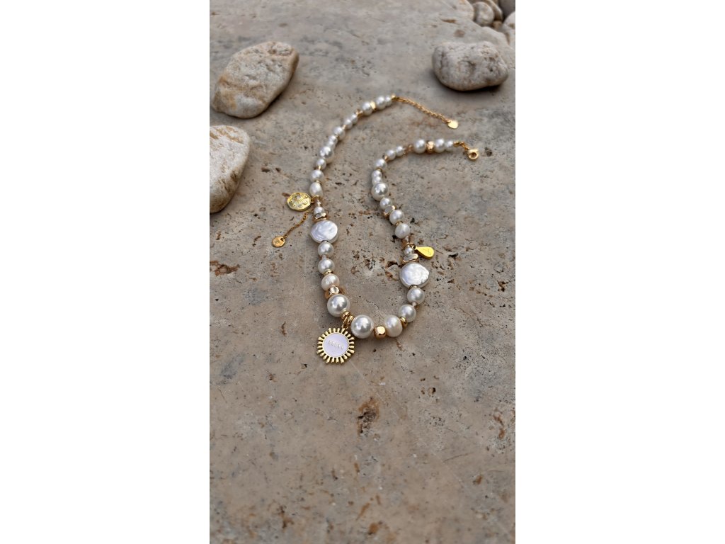 Ručne vyrobený zo sladkovodných perál, doplnený pozlátenými 18K detailmi slnka a mesiaca a ikonickým príveskom 11:11 – symbolom chvíle, kedy sa zastaví čas.