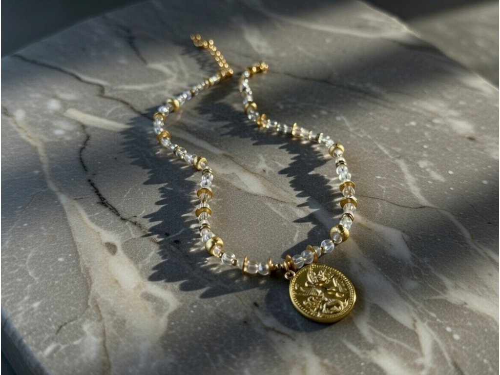 Tento elegantný náhrdelník spája jemnosť priezračných krištáľov so žiarou zlatých detailov. Dominantný prívesok v tvare mince prináša symbol hojnosti, slobody a ochrany.