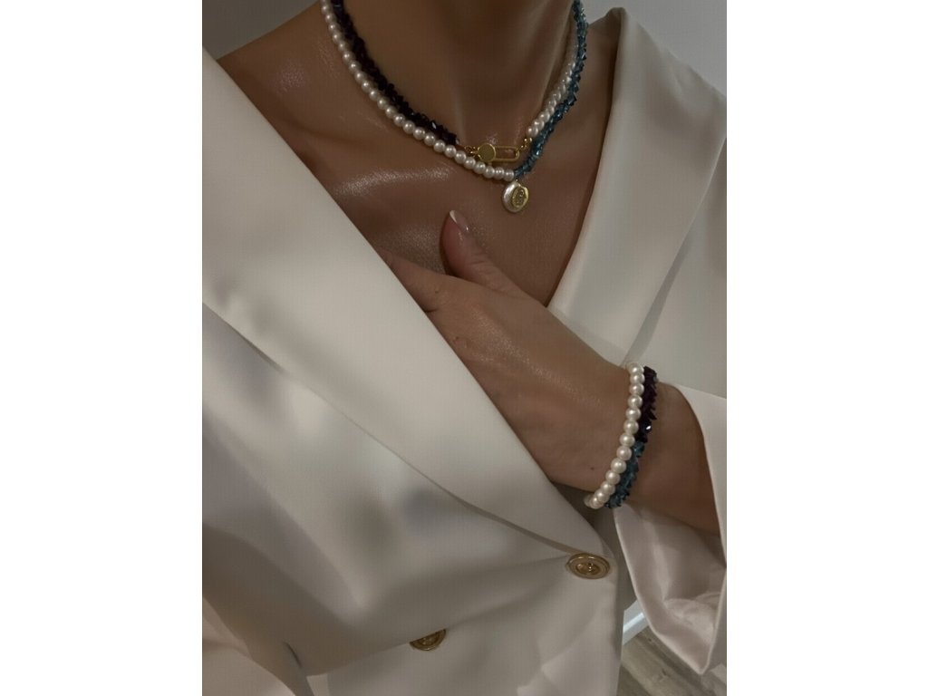 Perla dodáva šperku nadčasovú ženskosť a čistotu, zatiaľ čo modrý a fialový kryštál prinášajú harmóniu, rovnováhu a jemnú energiu. Náhrdelník pôsobí ľahko, luxusne a prirodzene rozžiari každý outfit.