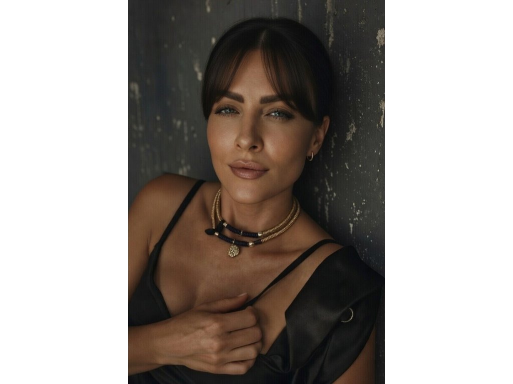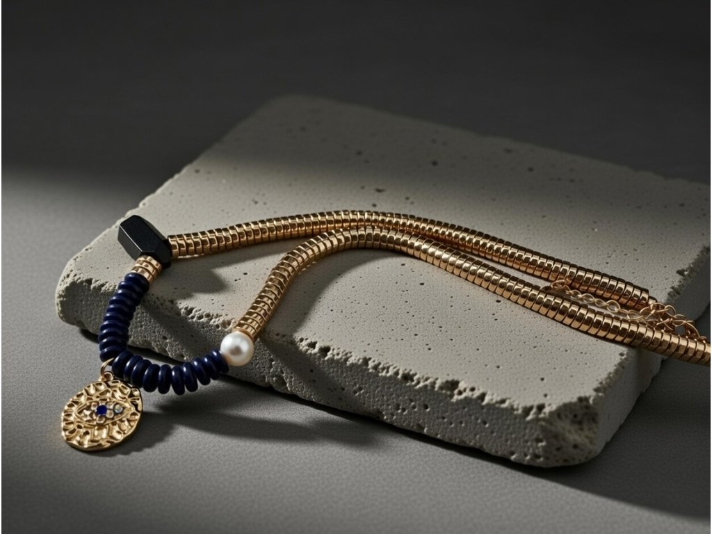 Objav harmóniu a ochranu v jednom kúsku. Tento jedinečný náhrdelník spája zlatý hematit, lapis lazuli, perlu a asymetrický turmalín s elegantným príveskom v tvare oka, ktorý symbolizuje ochranu, intuície a vnútornú silu. Každý kameň bol starostlivo vybraný pre svoju energiu: hematit ukotvuje, lapis lazuli podporuje jasnosť mysle, perla prináša jemnosť a čistotu, turmalín chráni a harmonizuje.