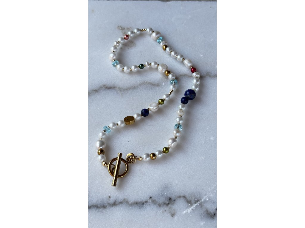 Náhrdelník „Ocean Pearl“ je štýlovým spojením prírodných perál, polodrahokamov a zlatých akcentov. Perly sú doplnené o modrý lapis lazuli a iskrivý modrý topás, ktoré dodávajú šperku hĺbku a charakter. Výrazná kruhová spona v zlatej farbe slúži aj ako dizajnový prvok.