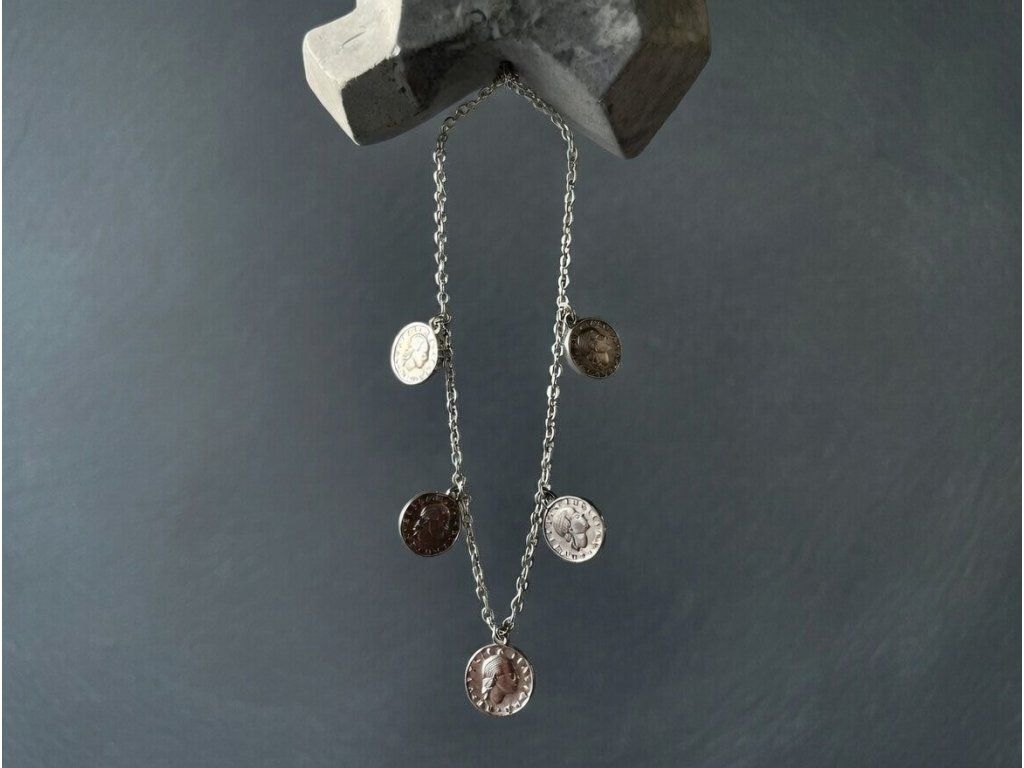 Nadčasový náhrdelník s mincovými príveskami v striebornej farbe, ktorý spája jemnosť a eleganciu. Symbolické motívy na príveskoch dodávajú šperku jedinečný charakter a príbeh. Ideálny na vrstvenie, no krásne vynikne aj samostatne. Perfektný doplnok, ktorý podčiarkne vašu osobnosť a štýl.