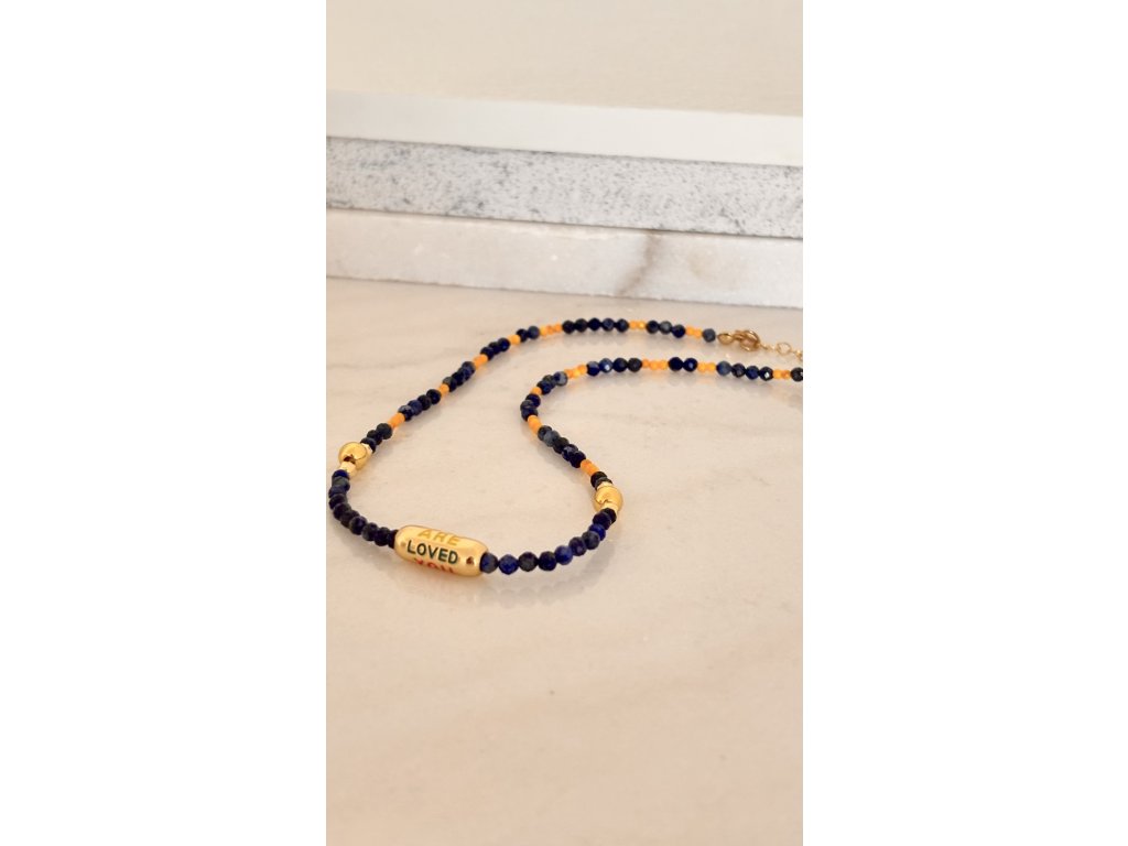 Tento luxusný náhrdelník spája hlbokú modrú energiu lapis lazuli, žiarivé brúsené žlté korálky a elegantné 18K pozlátené detaily, ktoré pôsobia štýlovo a žensky.