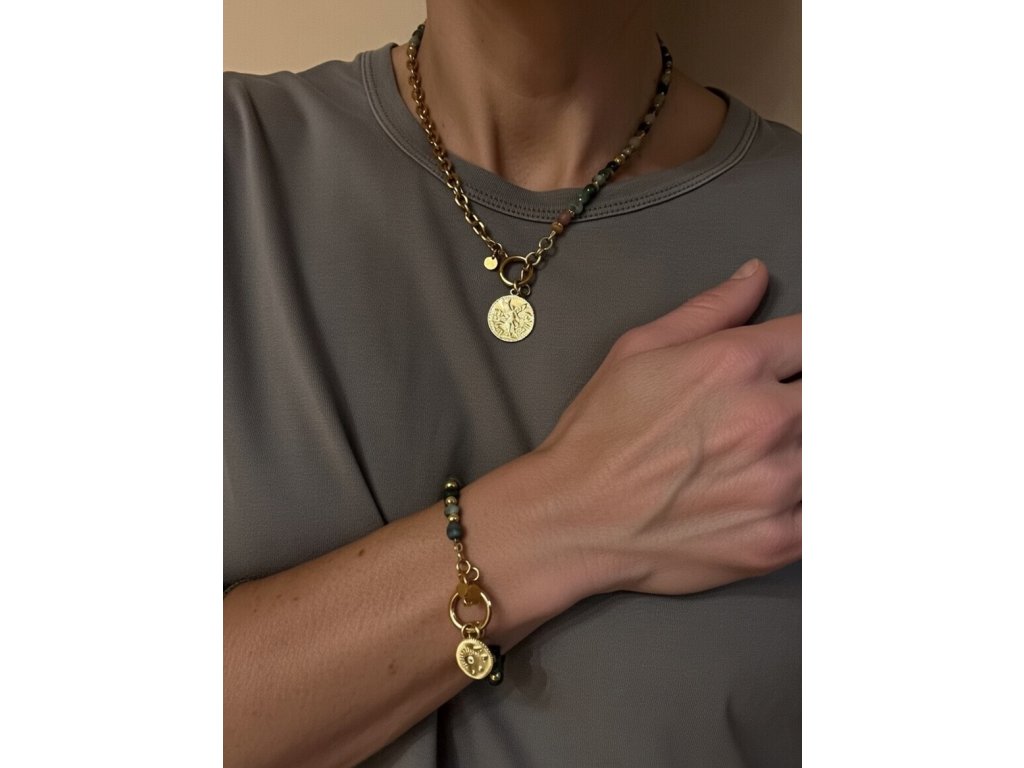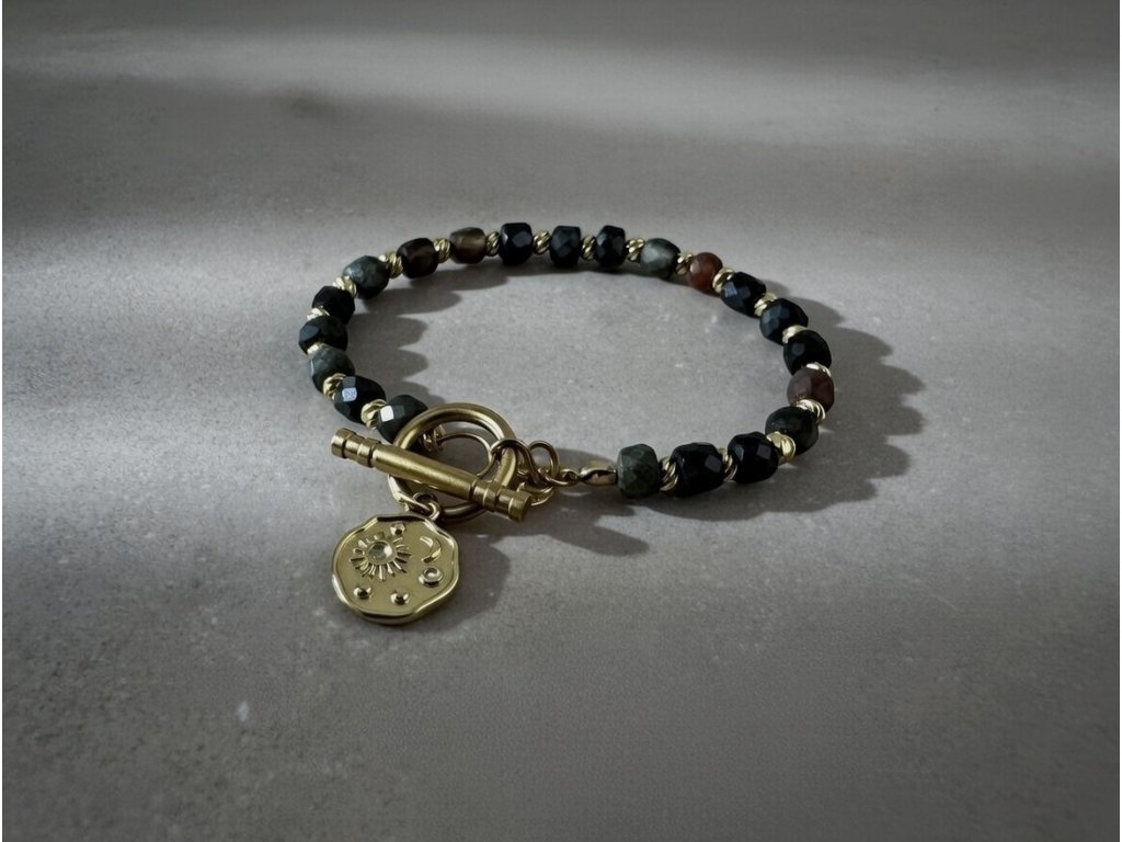 Tmavý achát s fazetami + zlaté 18K plated dieliky. Jednoduchý toggle zapínanie a slnečný prívesok.
