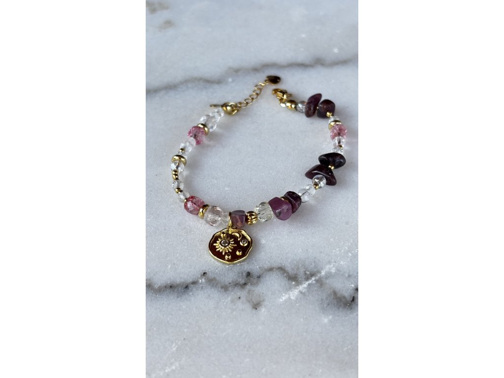 Ručne vyrobený náramok „Sun Harmony“ je klenotom, ktorý v sebe spája jemnosť prírody a silu svetla. Vznikol z harmonickej kombinácie ametystu, ruženínu, horského krištáľu a zlatých detailov – každý prvok starostlivo vybraný pre rovnováhu a krásu. Dominantný zlatý detail v podobe slnečného symbolu reprezentuje vnútorný lesk, nádej a nový začiatok.