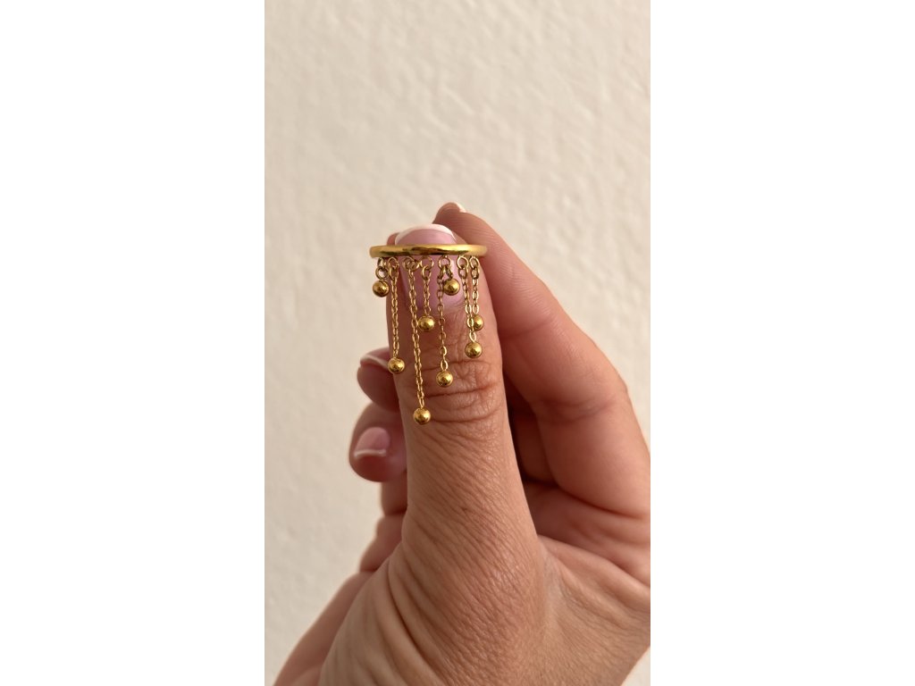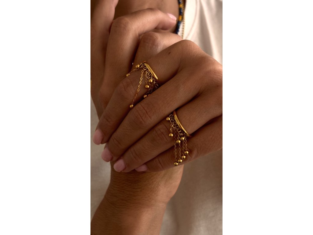 Z prsteňa voľne splývajú drobné retiazky so zlatými guľôčkami, ktoré sa pri každom pohybe jemne hojdajú a odrážajú svetlo. Vytvára tak efektný, hravý a pritom luxusný dojem – šperk, ktorý okamžite pritiahne pozornosť.